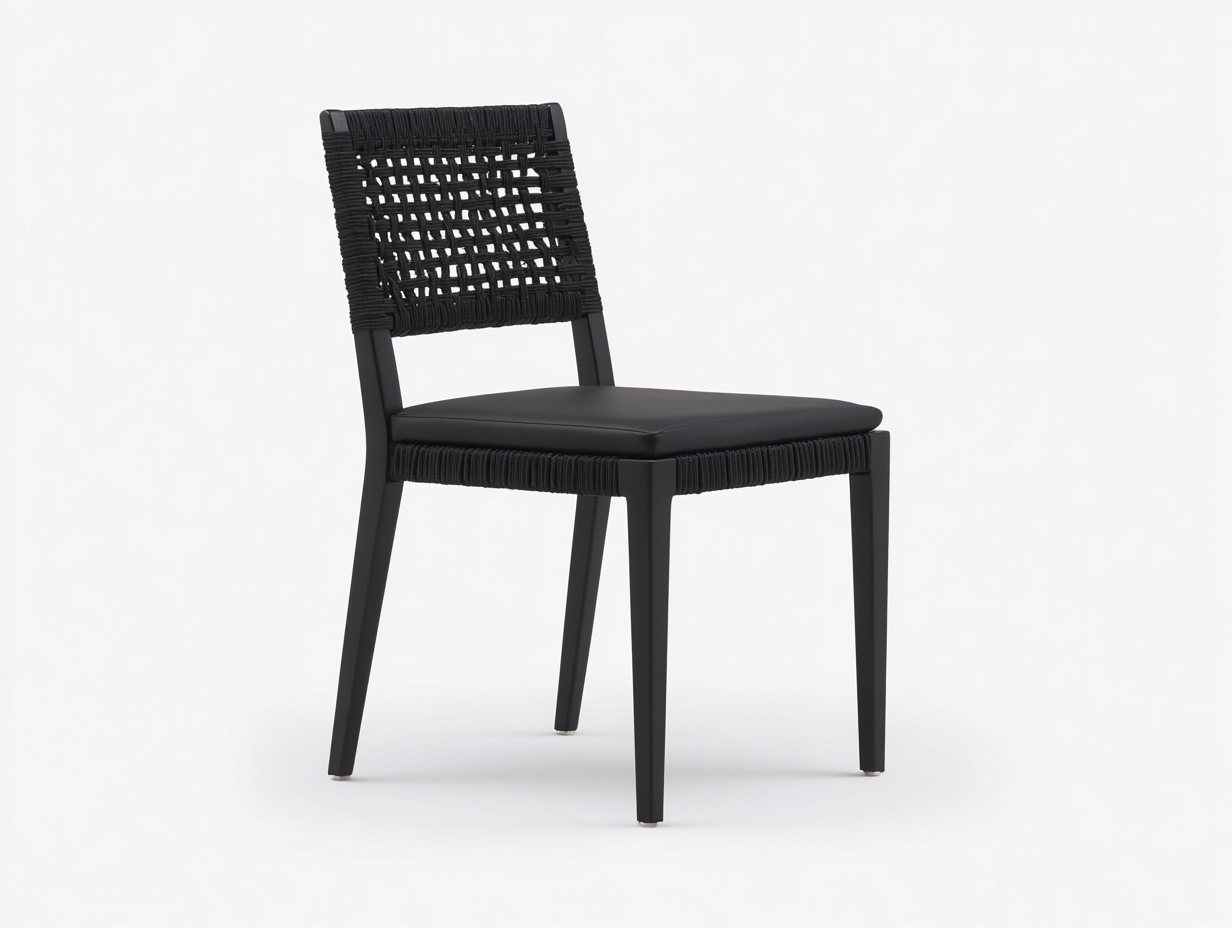 La estructura está fabricada en metal con acabado en color negro que proporciona estabilidad durante el uso. El respaldo incorpora cuerda trenzada resistente que favorece la ventilación y mantiene una estructura firme. El asiento cuenta con una superficie acolchada que aporta soporte al sentarse. La combinación de metal y cuerda trenzada crea una estructura funcional para espacios exteriores.
