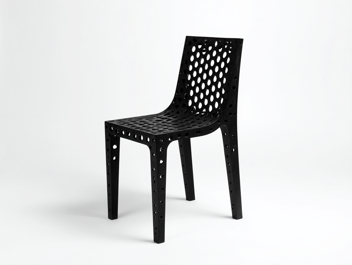 La silla está fabricada en plástico resistente en color negro, material adecuado para uso exterior por su ligereza y facilidad de mantenimiento. La superficie perforada del asiento y del respaldo favorece la ventilación durante el uso y contribuye a reducir la acumulación de agua después de la lluvia. Su estructura de una sola pieza proporciona estabilidad y durabilidad.